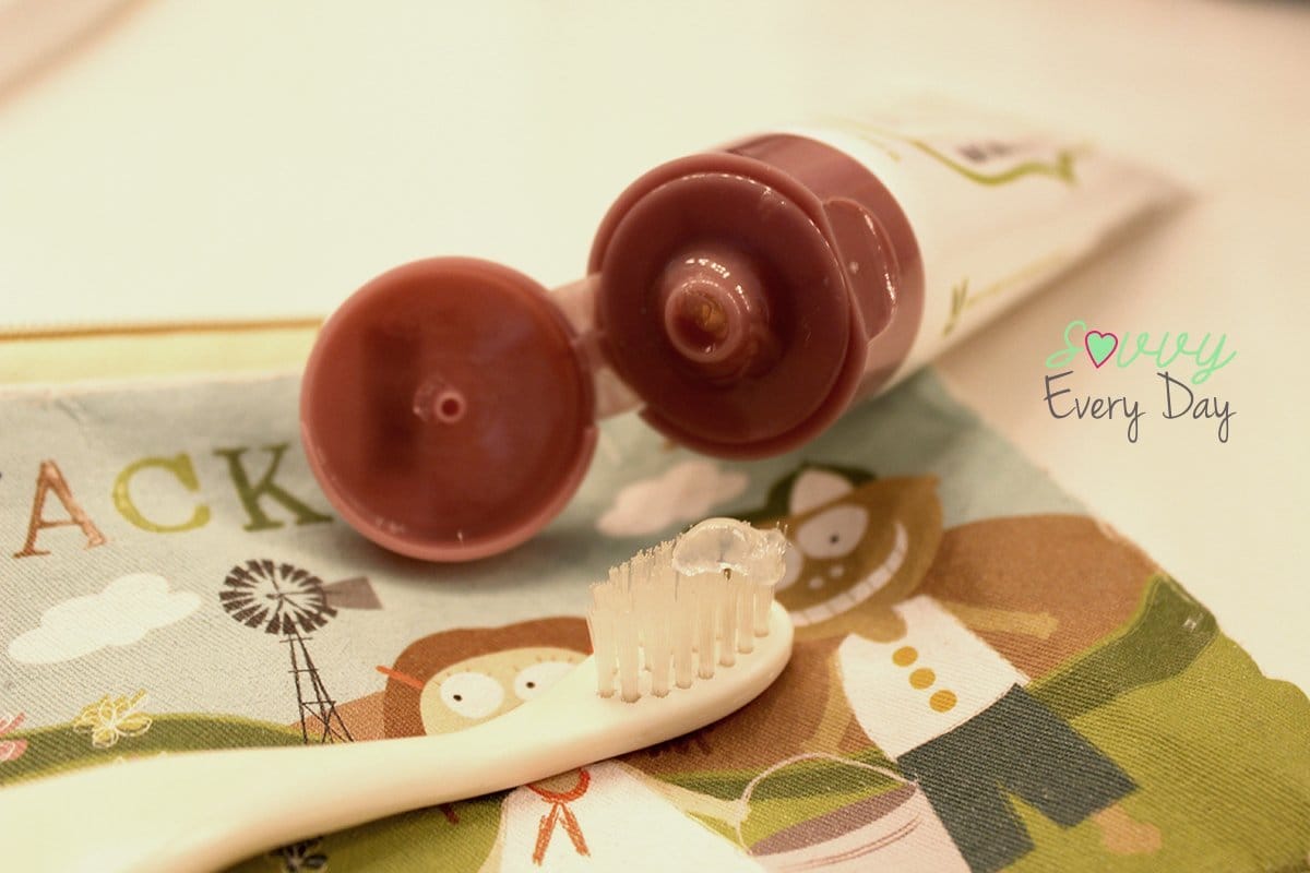 I like to have a fluoride-free toothpaste handy for S to use when she wants to practice brushing without my assistance so I know if she doesn’t brush it all out properly it’s still safe, and she isn’t getting excessive amounts of fluoride. We also carry this fluoride-free toothpaste around during the day in case she needs to brush her teeth in the middle of the day after a sweet treat or snack that gets caught in the biting surfaces of her teeth.