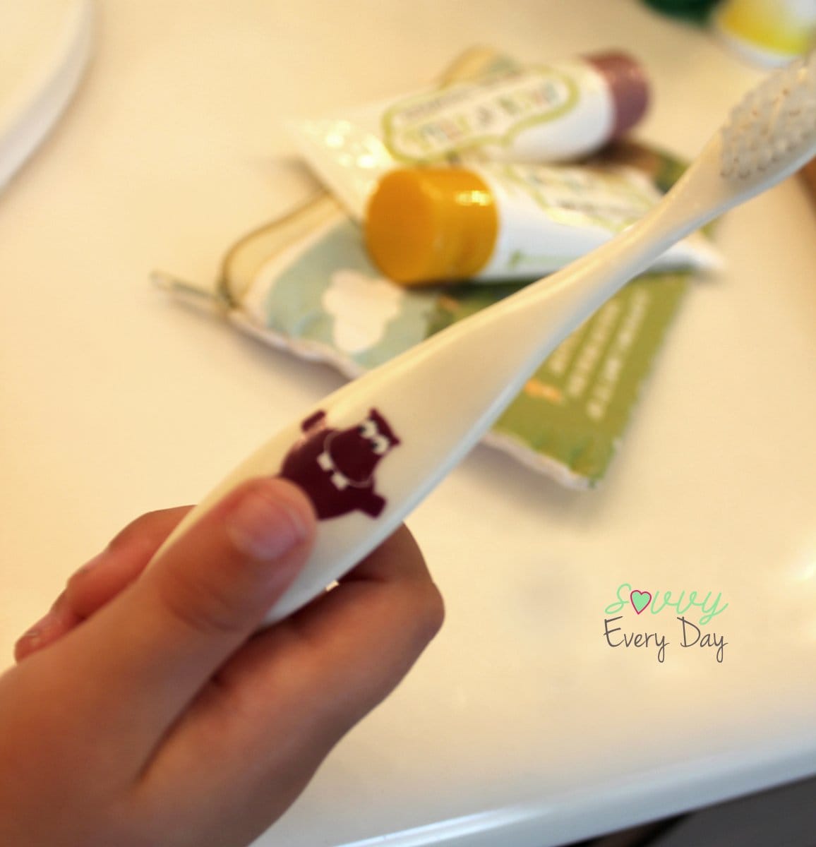 The next day, I told her I wanted to take a picture of her holding her new toothbrush, and needed a photo of the brush with the toothpaste on it to show everyone that it was clear because it was dye-free. This got my preschooler involved — she was happy to help mommy. While posing for the picture S began brushing her teeth with the banana toothpaste (she loves getting to brush her teeth all by herself) and telling me how delicious it is. Aha! It’s all about how you approach things with little ones.